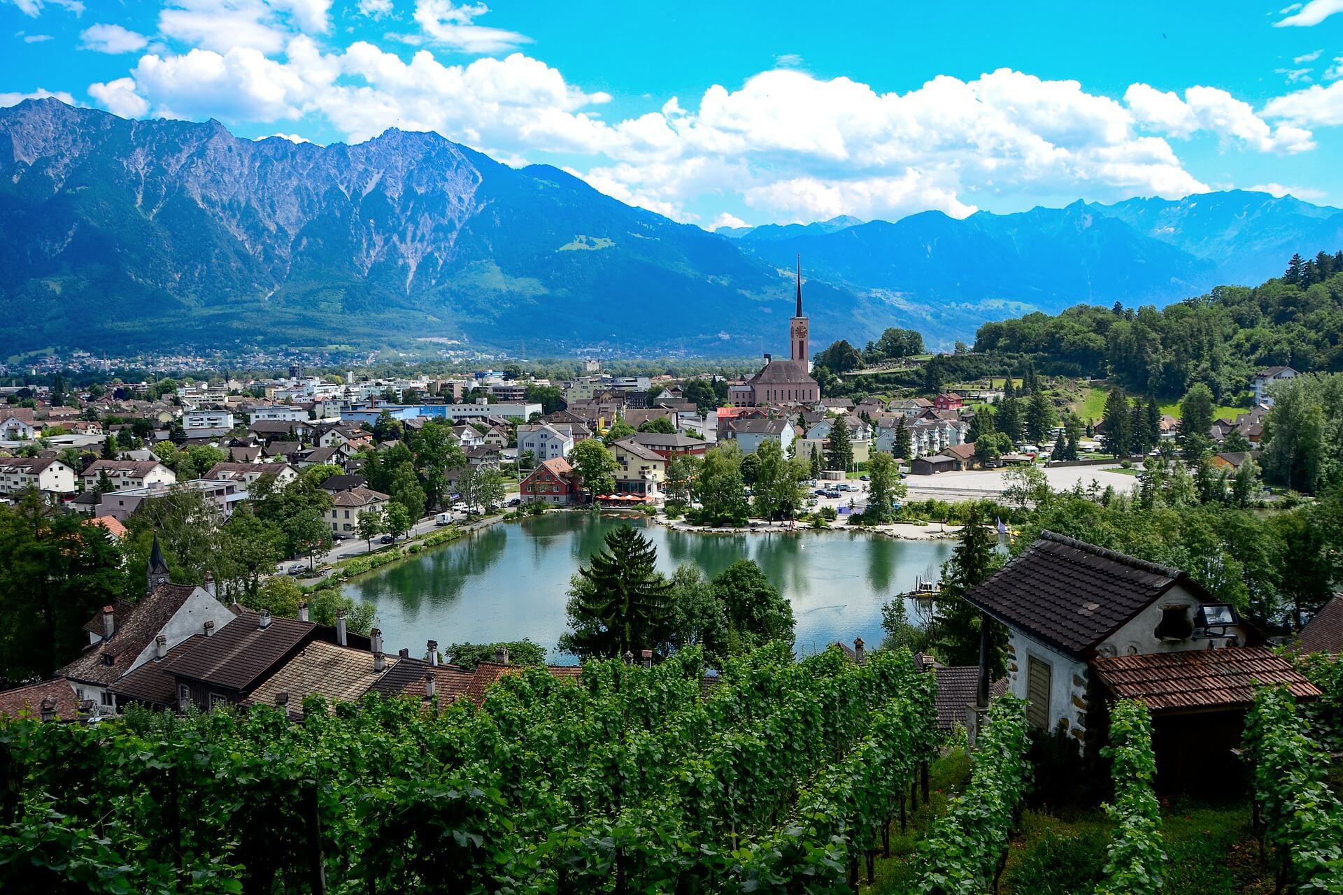 Desayuno. Por encima de los viñedos en terrazas de La Côte, abajo, en el lago, las ciudades mercado de Morges, Rolle y Nyon. Villas y yates y la cosmopolita ciudad de Ginebra se anuncia con bulevares y sus 140 y su fuente de agua "Jet d'eau" de 140 m de altura.
