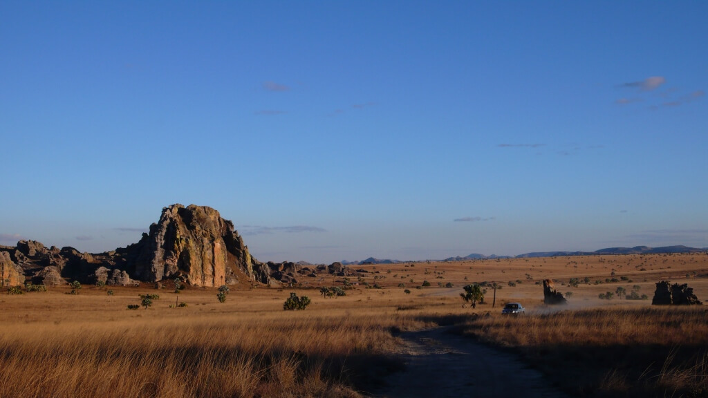 Etapa larga de ruta. Desayuno al alba y ruta hasta la ciudad de Miandrivazo. Viajaremos desde la región de Menabe hasta las Tierras Altas pasando por Malaimbandy y Mahabo, donde hubo en el pasado las antiguas aldeas reales Sakalava. Nos detendremos en algún restaurante popular para almorzar en Miandrivazo y continuaremos a través del paisaje de lavakas hasta el poblado de Mandoto, donde podremos estirar las piernas. Llegada por la tarde a Antsirabe e instalación en el hotel. ROYAL PALACE 3* [Alojamiento-Desayuno]